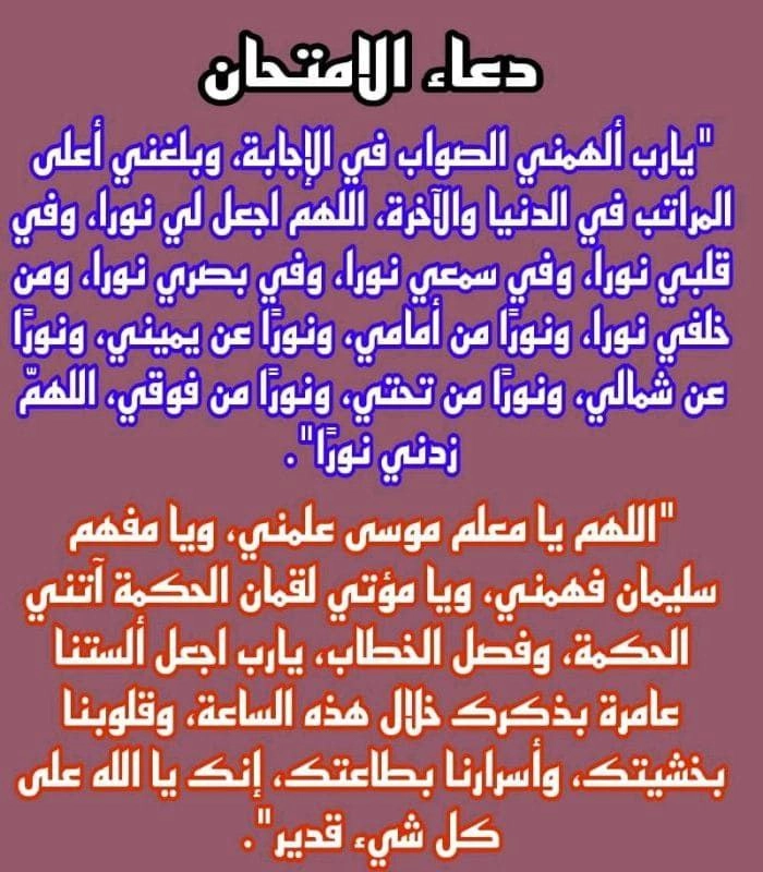 يحرص الطالب على الدعاء قبل الامتحان وبعده بالنجاح والتوفيق ومن ادعيه قبل الامتحان وبعده دعاء الامتحان الآتي: