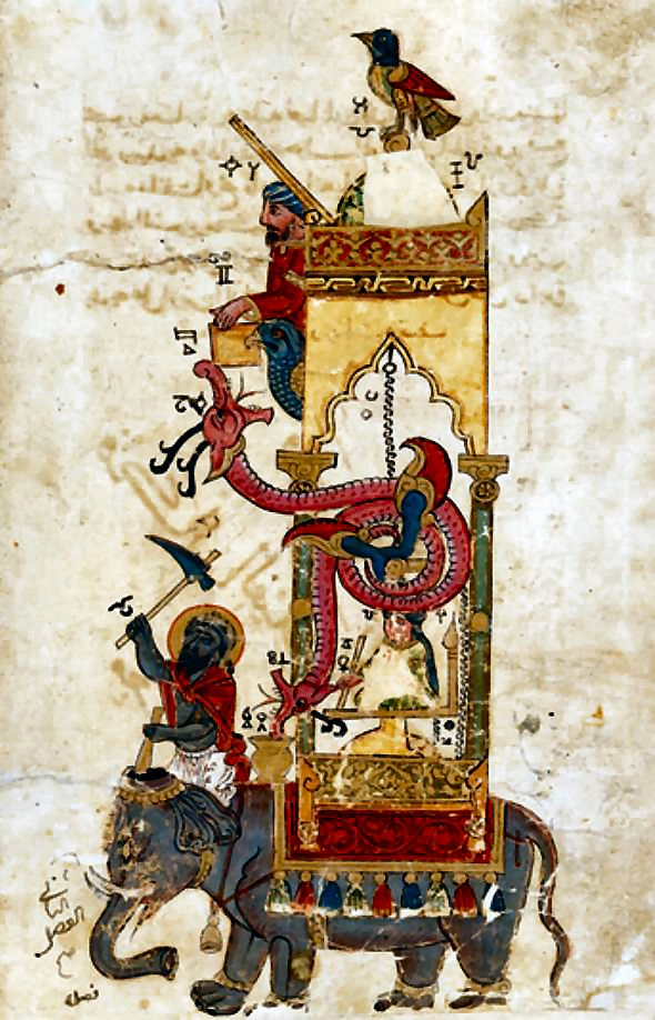 يوجد خزان ماء داخل الفيل يحتوي على وعاء مثقوب (توقيت مائي).